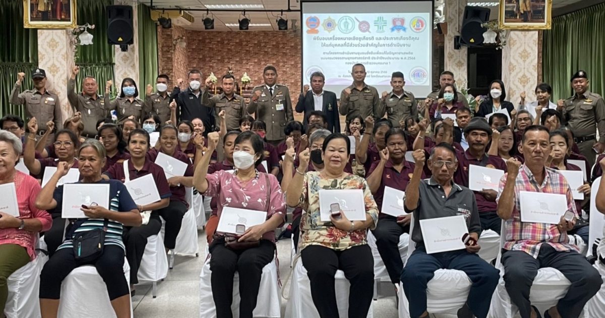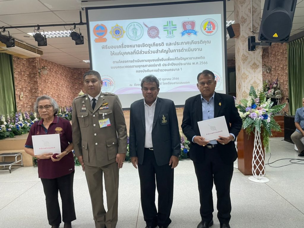 ในพิธี มอบเครื่องหมายเชิดชูเกียรติและใบประกาศนียบัตร ผู้ที่มีส่วนร่วมสำคัญในการดำเนินโครงการดำเนินงานชุมชนยั่งยืน เพื่อแก้ไขปัญหายาเสพติดแบบครบวงจรตามยุทธศาสตร์ชาติ ประจำปีงบประมาณ พ.ศ.2566 ในวันอังคารที่ 10 ตุลาคม 2566 ณ ห้องประชุมครองราชย์ โรงเรียนสามเสนนอก