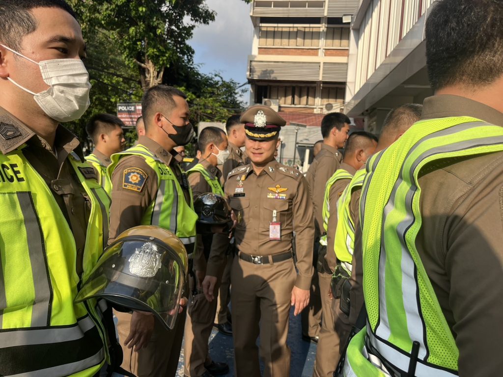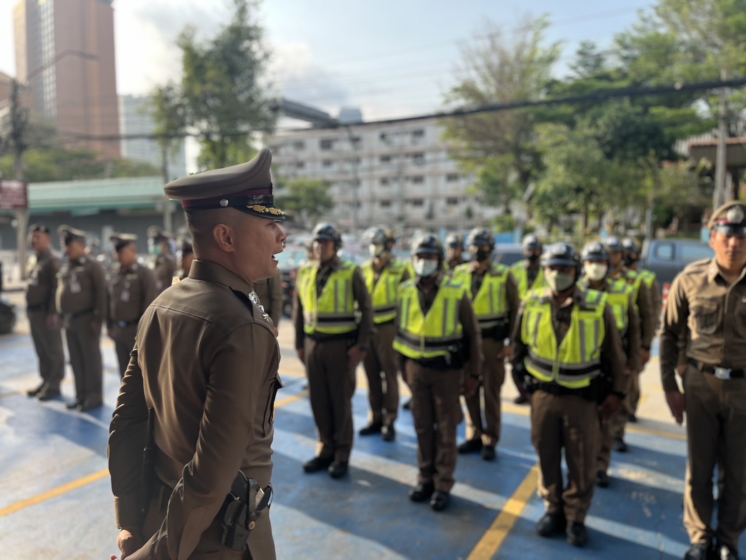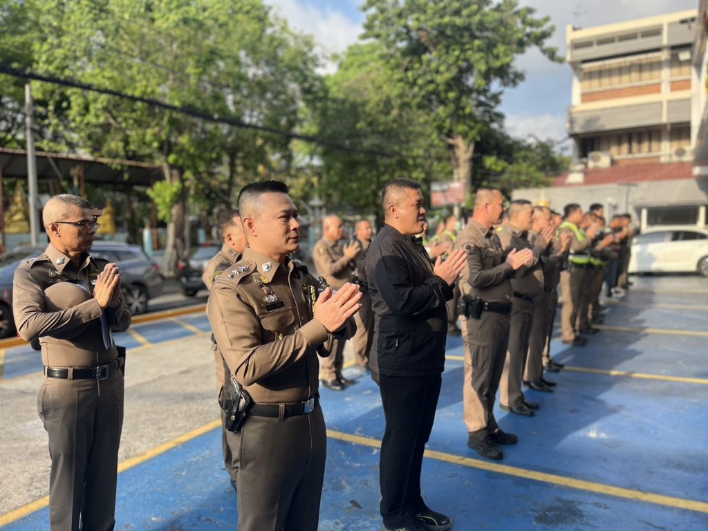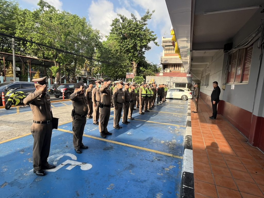 เจ้าหน้าที่ตำรวจ สน.ห้วยขวาง เข้าแถวเคารพธงชาติ นำโดย