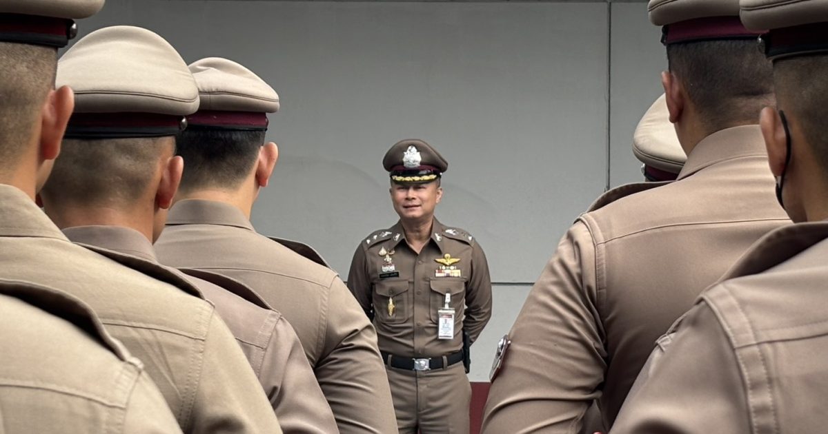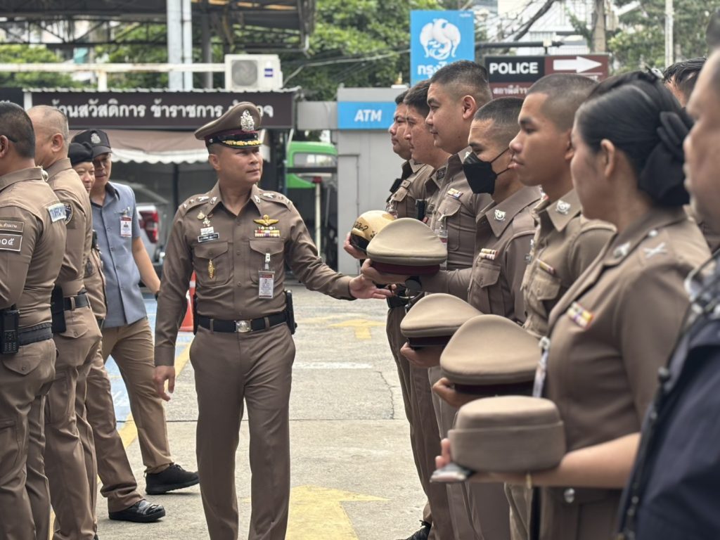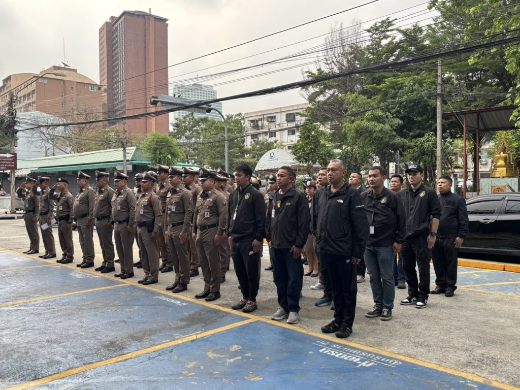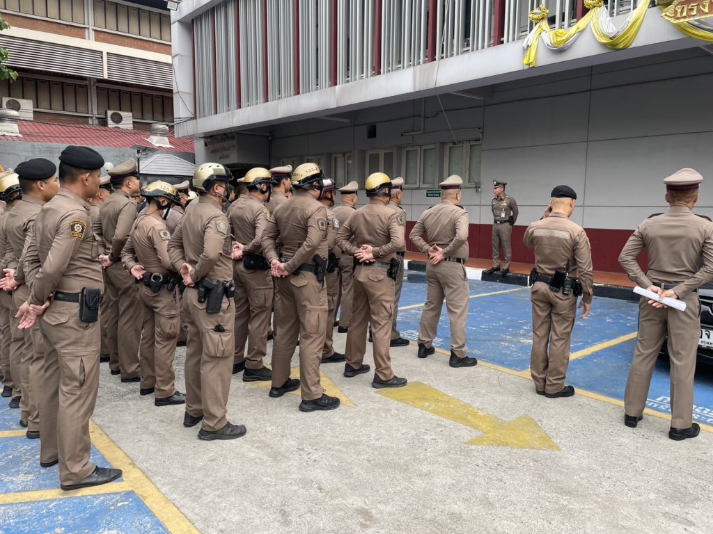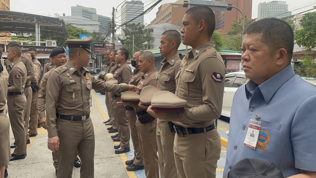 พ.ต.อ.ประสพโชค เอี่ยมพินิจ ผกก.สน.ห้วยขวาง พร้อมข้าราชการตำรวจ สน.ห้วยขวาง เข้าแถวเคารพธงชาติ , การตรวจเครื่องแต่งกายและทรงผมตามระเบียบราชการ พร้อมกำชับการปฏิบัติหน้าที่ให้ถูกต้องตามระเบียบอย่างเคร่งครัด ณ บริเวณลานหน้า สน.ห้วยขวาง