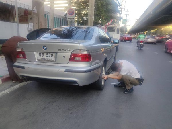 รักเกิดจากใจ เมื่อท่านทุกข์เราพร้อมจะคลายทุกข์ให้เจ้าหน้าที่ตำรวจ จราจร สน.ห้วยขวาง ช่วยเหลือรถยางรั่ว บริเวณหน้าห้างเซนทรัลพระราม9
