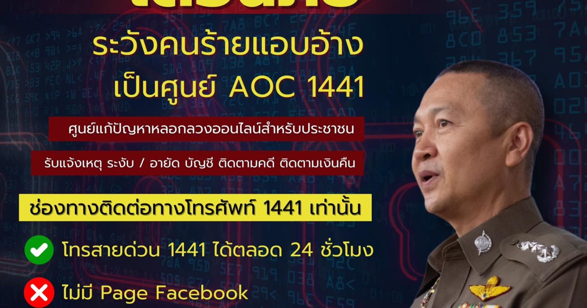 สำนักงานตำรวจแห่งชาติขอแจ้งให้ทราบว่า AOC 1441 เป็นศูนย์ One Stop Service จัดตั้งโดยกระทรวงดิจิทัลเพื่อเศรษฐกิจและสังคม เพื่อแก้ปัญหาหลอกลวงออนไลน์สำหรับประชาชน มีการจัดตั้งวอร์รูมเพื่อดำเนินการด้านคดีให้กับประชาชนแบบเร่งด่วน เชิงรุก ตั้งเป้าหมาย จบระงับ/อายัด บัญชีการเงินได้ ใน 1 ชม. นับจากเวลาที่รับแจ้งเรื่องจากเหยื่อของโจรออนไลน์ โดยมีเป้าหมายในการจัดตั้งเพื่อ