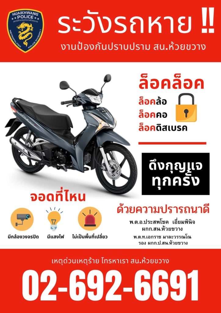 เจ้าหน้าที่ตำรวจฝ่ายป้องกันปราบปราม ประชาสัมพันธ์ป้องกันรถหายด้วยวิธีการ 3 ล็อค ล็อคล้อ  ล็อคคอ ล็อคดิสเบรค ตามมาตรการป้องกันปราบปรามเชิงรุก ในการป้องกันเหตุลักทรัพย์รถจักรยานยนต์ภายในพื้นที่เขตรับผิดชอบ